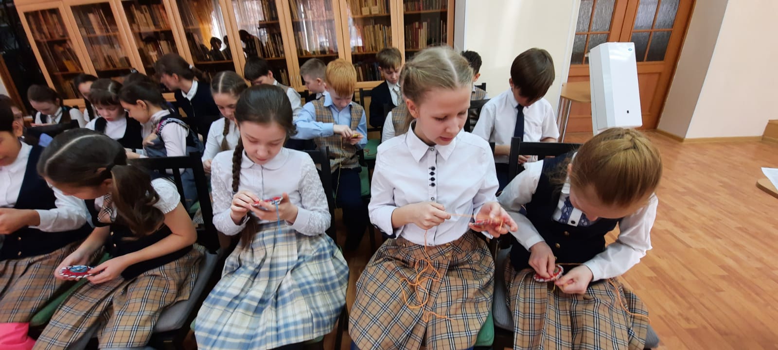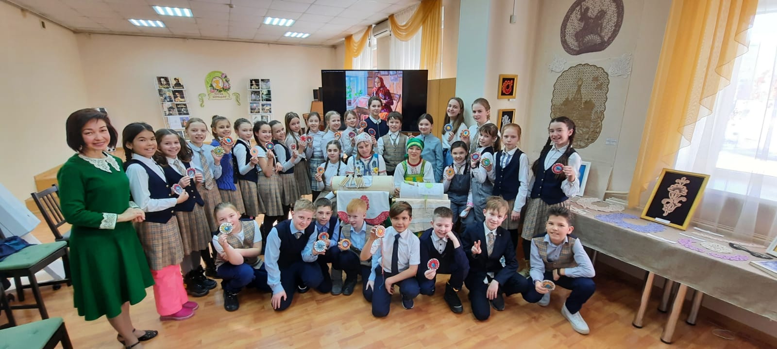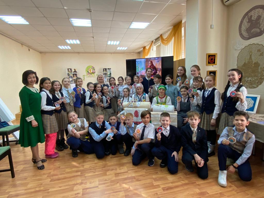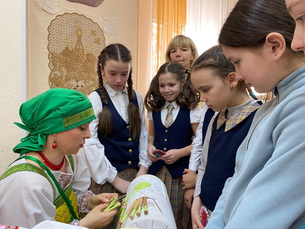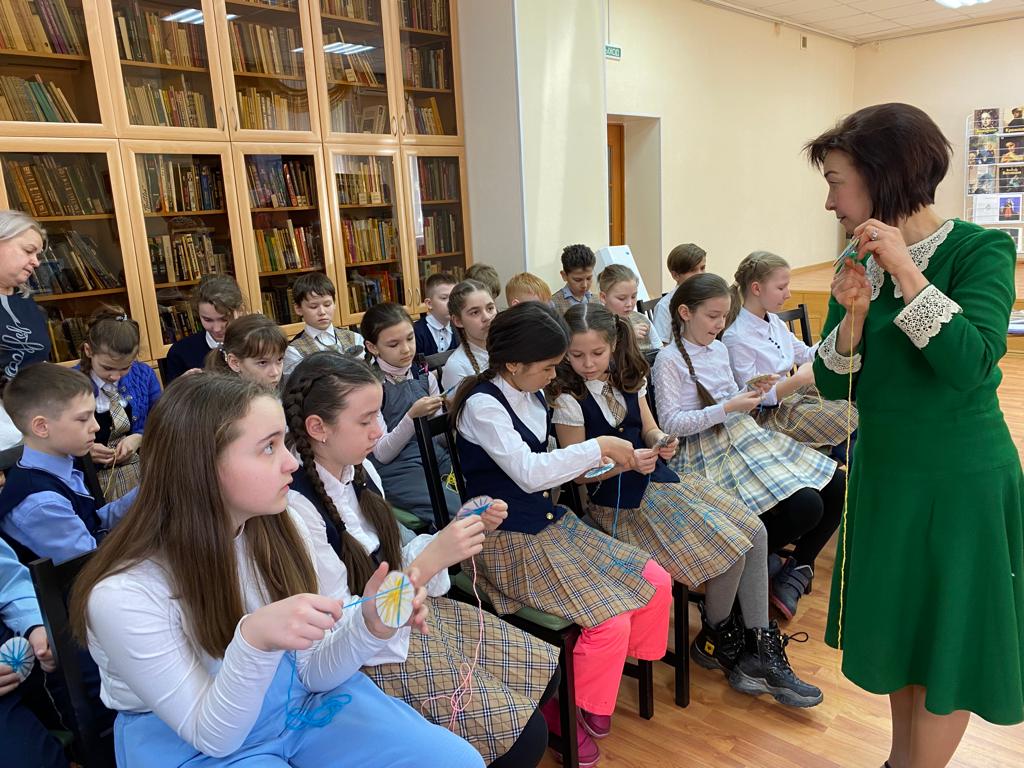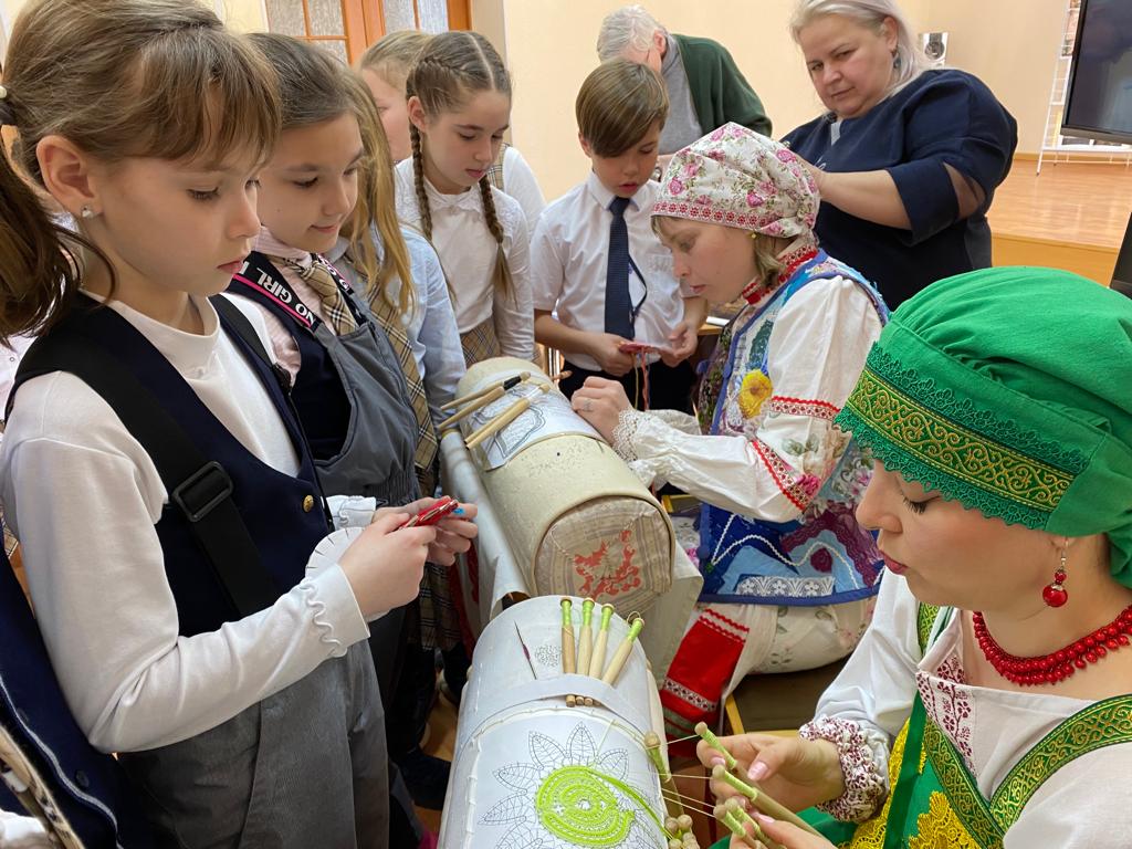 В рамках объявленного в России 2022 года – Годом культурного наследия народов России, 18 марта 2022 года учащиеся 4А класса МБОУ «Лицея №21» посетили Центральную городскую детскую библиотеку имени Ш.А. Худайбердина, где состоялось торжественное открытие выставки «Уральские сказания о кружеве» и интереснейшая встреча с членами клуба кружевниц «Плетешок», что находится под крышей Уфимского подросткового клуба «Радуга» МБУ ОКДПМ «Диалог». В просторном зале эстетического воспитания библиотеки была подготовлена экспозиция, разместившаяся в застекленных шкафчиках, на столах и стенах: образцы вологодских, киришских и вятских кружев, изделия мастериц «Плетешка», старинные коклюшки, валик-кутуз с начатым узором.