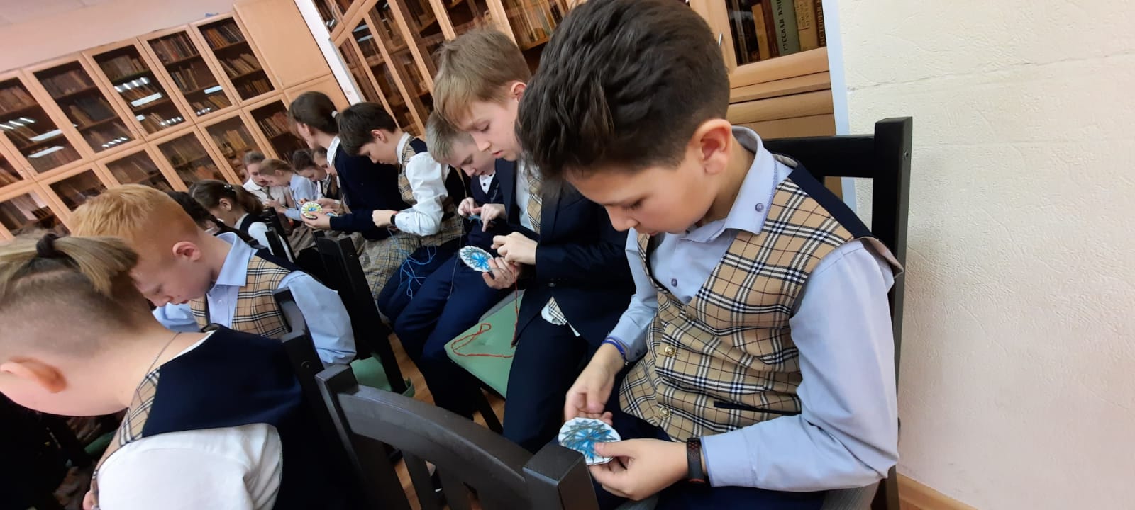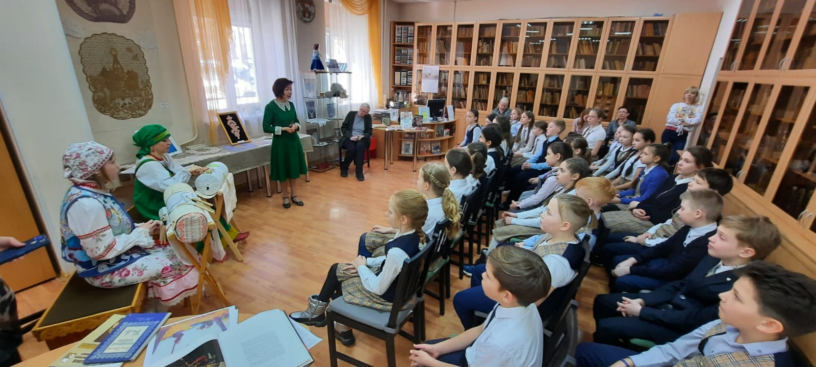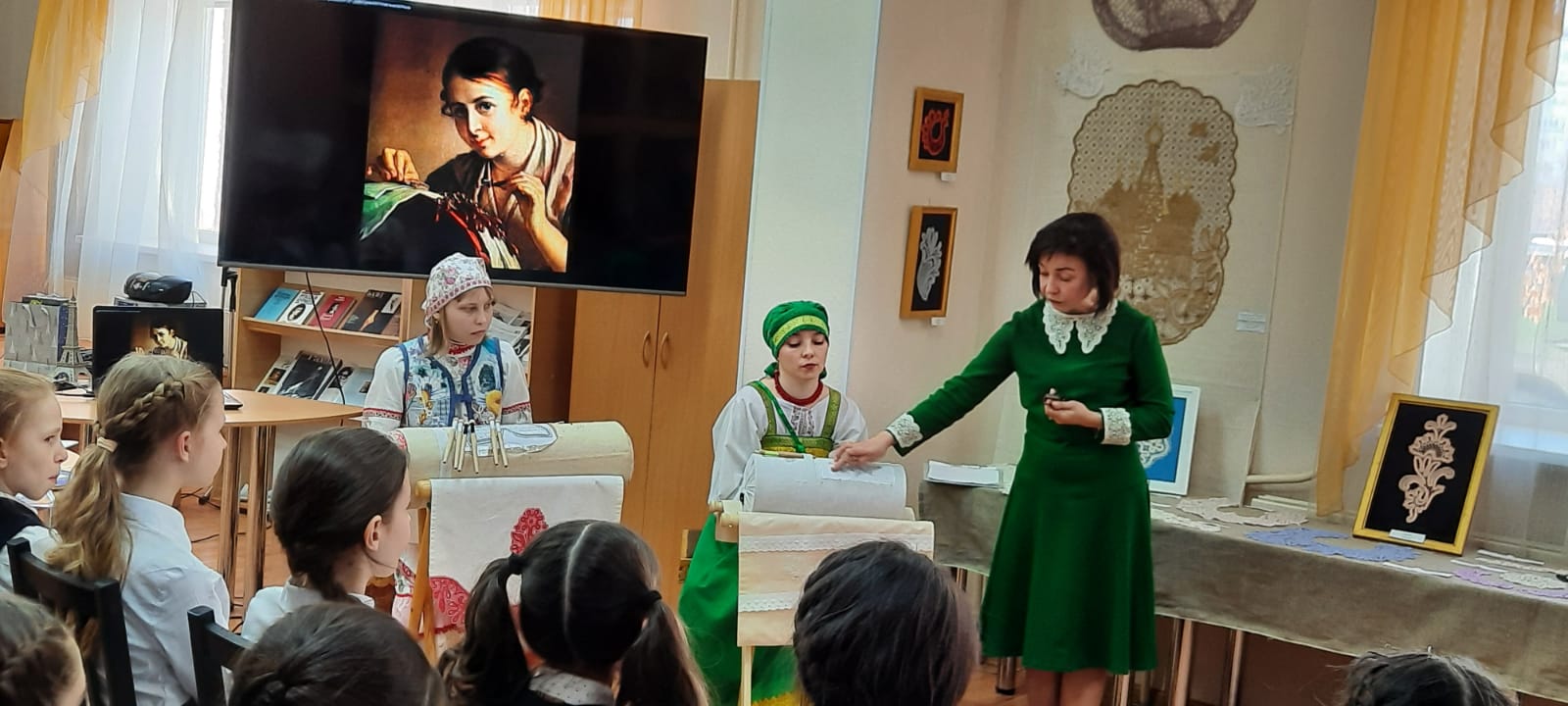 Заведующая сектором Светлана Ермакова дополнила ее книжной выставкой по истории русского костюма, народных ремесел, кружевоплетения. Руководитель клуба кружевниц Лариса Клих рассказала ребятам о том, как зародился этот вид рукоделия на Руси, как в разных местах России появились свои приемы выделки кружев, свои орнаменты и виды используемых нитей, как вологодское кружево попало в Башкортостан. Рассказ ведущей сопровождался чуть слышным побрякиванием палочек-коклюшек в проворных руках мастериц Анастасии Шалдиной и Евгении Вязовой, одетых в народные костюмы: с повойниками на головах, в рубахах с пышными рукавами в кружевных оборках, сарафанах и жилетах-размахайках, с сумочками-лакомниками через плечо. На подставках-козелках струился затейливый узор «бабочка» и «подсолнух». Ребята внимательно слушали рассказ руководителя клуба кружевниц, тем временем безотрывно следя за процессом создания кружев, искренне удивлялись, узнав, что для создания некоторых кружевных изделий может использоваться больше трехсот коклюшек, что на создание даже не очень большой работы требуется два-три, а то и больше месяцев.