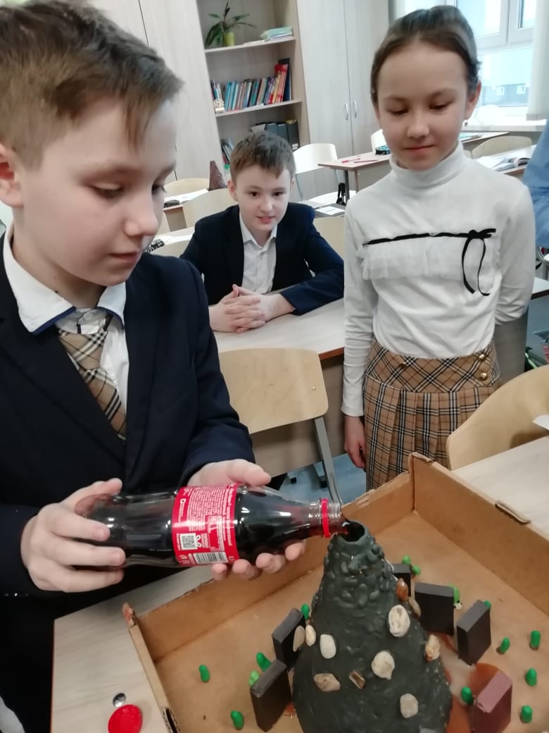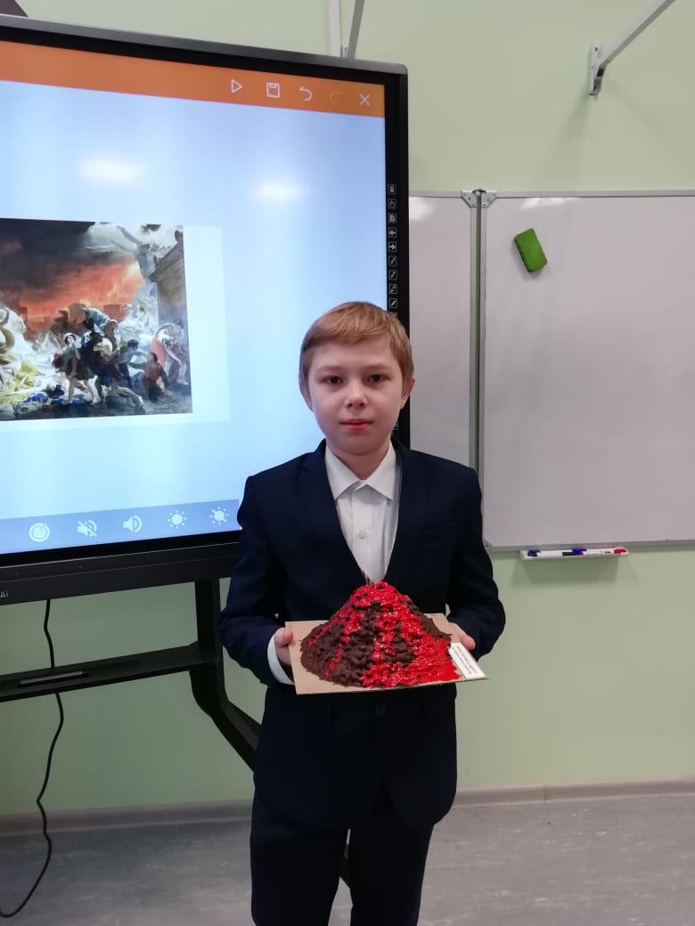 Проекты получились разные и по масштабу, и по выдумке. Кто-то сделал вулкан из пластилина и пластика, кто-то из глины, папьемашье, бумаги, соленого теста. Самые масштабные модели сделали ребята из 5 в класса. А девочки 5 А класса испекли торт в виде вулкана, а после урока "вулкан" ребята съели. Все были довольны своими проектами!
