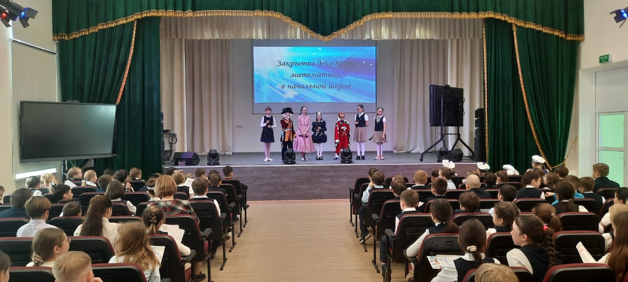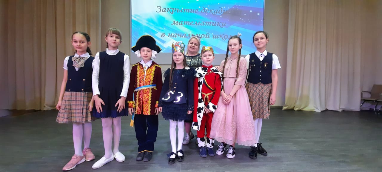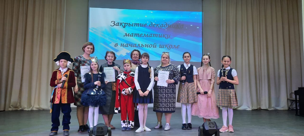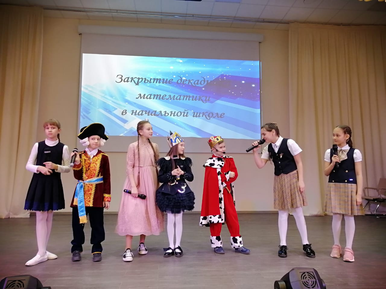 На церемонию закрытия декады математики творческая группа учащихся 4В класса под руководством классного руководителя Федоровой И.Г. подготовила театрализованное сказочное представление. В ходе него Царь с Царевной Несмеяной, Министр, Королева Математики, Эрудиты развлекали ребят и награждали самых лучших математиков. На сцене чествовали более 200 победителей и призёров математических олимпиад, конкурсов и чемпионатов, прошедших в рамках декадника