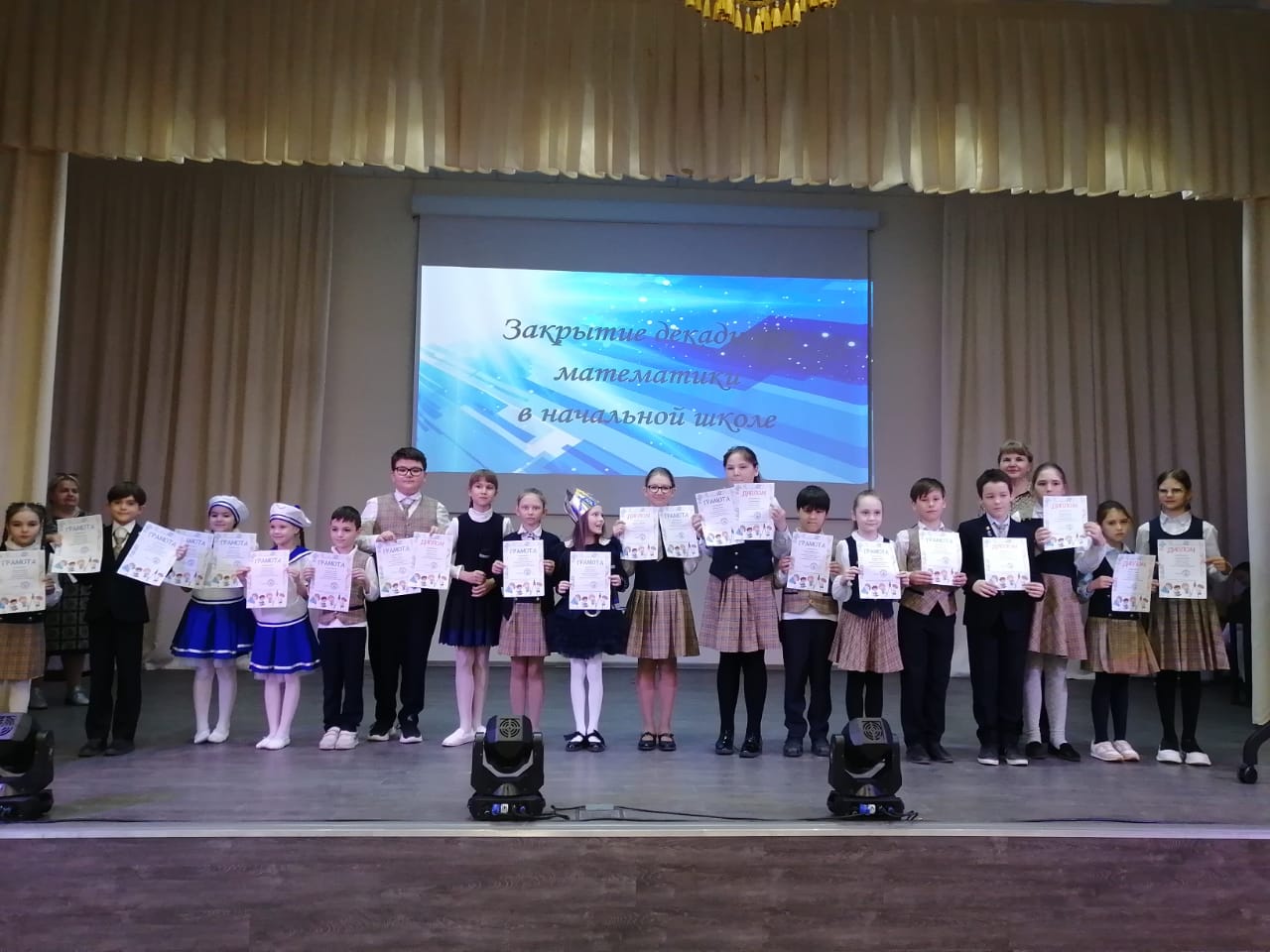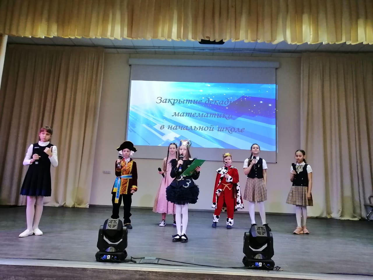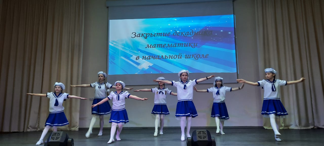 На церемонию закрытия декады математики творческая группа учащихся 4В класса под руководством классного руководителя Федоровой И.Г. подготовила театрализованное сказочное представление. В ходе него Царь с Царевной Несмеяной, Министр, Королева Математики, Эрудиты развлекали ребят и награждали самых лучших математиков. На сцене чествовали более 200 победителей и призёров математических олимпиад, конкурсов и чемпионатов, прошедших в рамках декадника