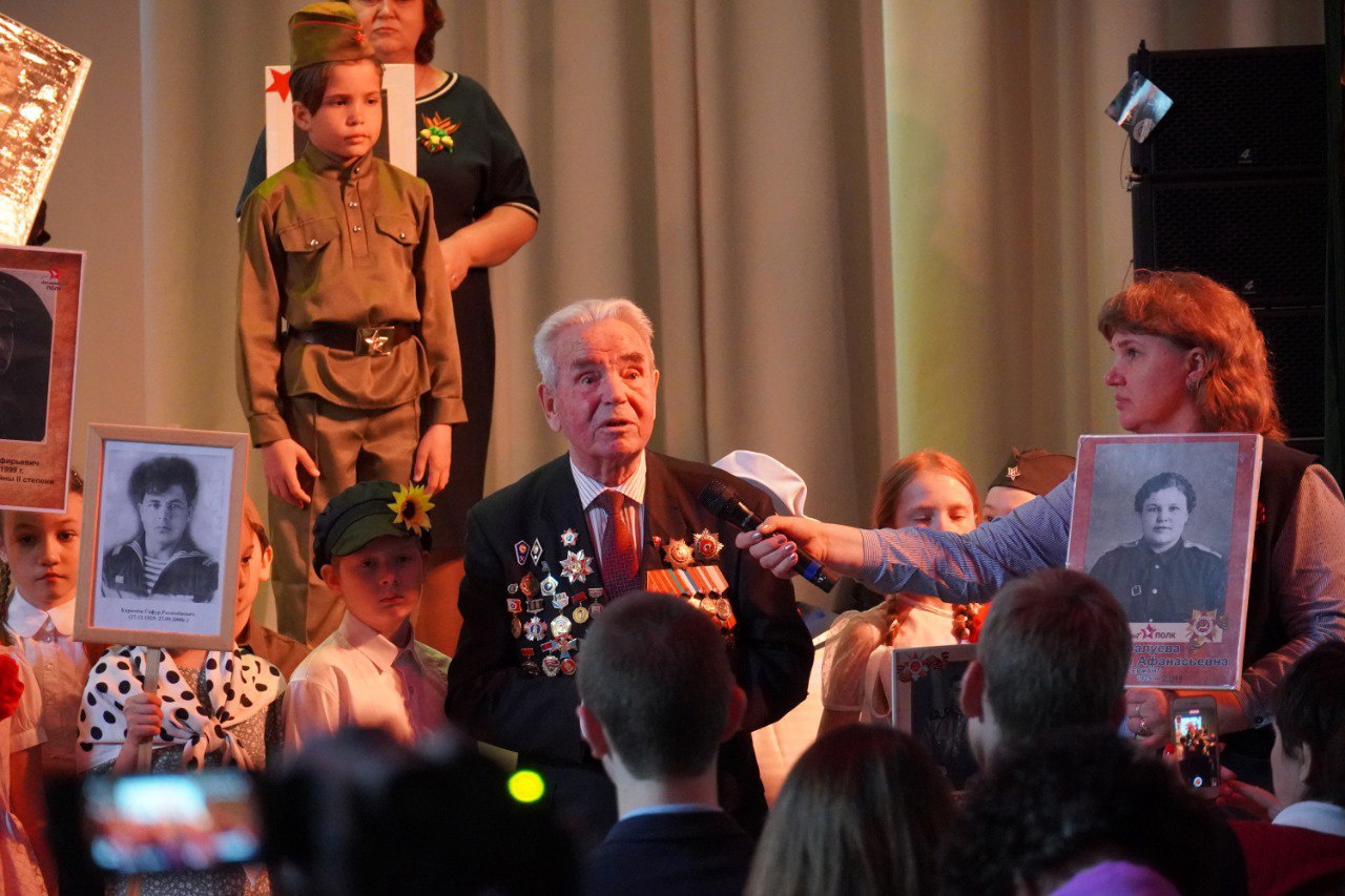 В память о тех, кто отдал свои жизни во имя Победы, была объявлена минута молчания. На концерте присутствовал ветеран, труженик тыла Ширяев Андрей Васильевич. Выступление Андрея Васильевича никого не оставило равнодушным. В своём обращении ко всем собравшимся он отметил, что 9 мая — День Победы — святой для каждого из нас праздник, и мы, сегодняшние граждане страны, обязаны передать память о Победе, о традициях празднования Дня Победы будущим поколениям. Ветеран поблагодарил за оказанные ему внимание и почет и дал наказ – беречь мир.