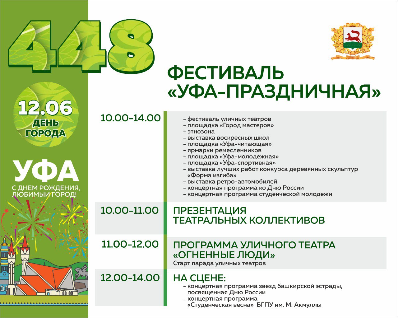К 12 июня для горожан и гостей столицы готовится масштабная развлекательная программа, посвящённая Дню России и Дню города Уфы. Главных площадок будет три. На одной из них состоится фестиваль «Уфа праздничная», в котором примут участие образовательные учреждения столицы.