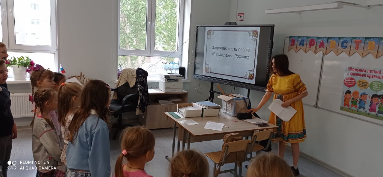 День завершился прохождением квеста, посвященному Дню России. 8 команд посещали станции по своему маршруту, зарабатывая баллы. Так, ребята разгадывали загадки, прошли викторину по страницам истории России, смастерили флаг нашей страны на станции "символы России", поиграли с традиционными дворовыми играми в спортивном зале, выучили флешмоб на станции "танцевальная", импровизировали сказку "теремок", собирали части пословицы в единое целое и на станции "Песенная" познакомились с видами песен.