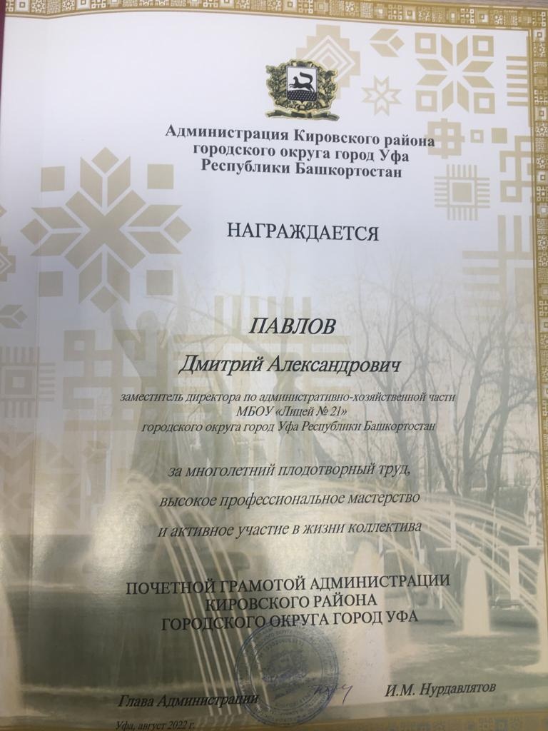 Торжественная часть сопровождалась чествованием лучших работников сферы образования района. Заслуженные награды получили более тридцати человек. Среди них был и Дмитрий Александрович Павлов, заместитель директора МБОУ "Лицей №21" по административно-хозяйственной части. Поздравляем Дмитрия Александровича с заслуженной наградой, желаем успехов и процветания!