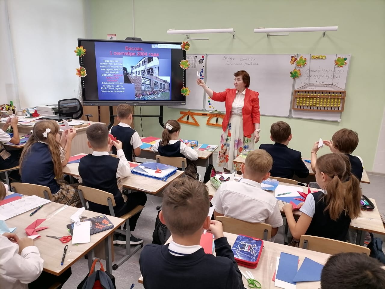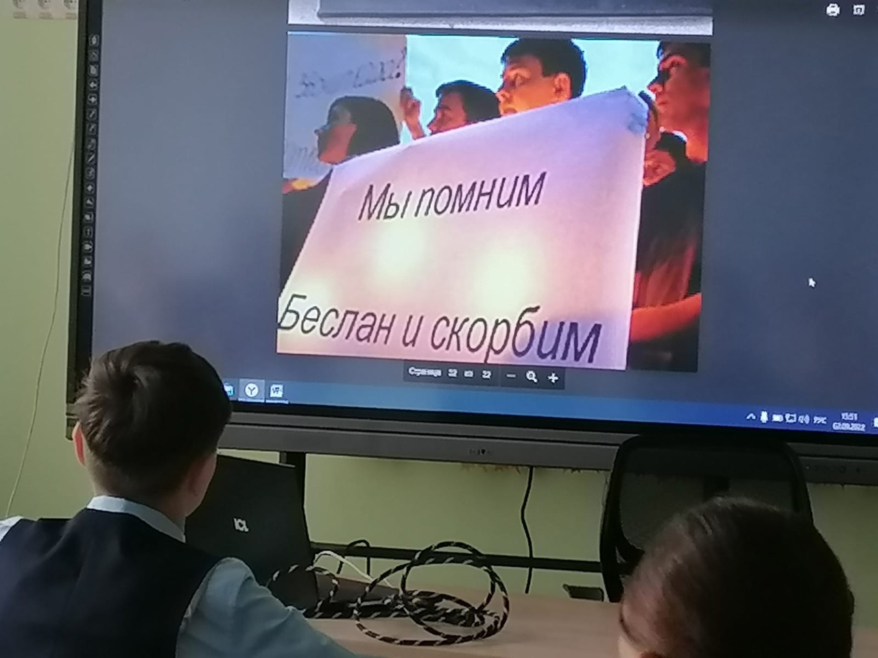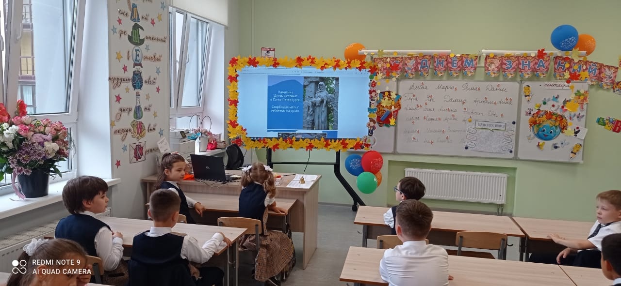 В ходе классных часов ребята узнали о том, что этот день приурочен к трагическим событиям, произошедшим 1-3 сентября 2004 года в городе Беслане. Уроки начались с разговора о том, что терроризм - величайшее и разрушительное зло, которому нет и не может быть оправдания. Ребята узнали, что День знаний 2004 года стал днем горя и слез. Три дня ада, мучений и издевательств, которым подвергались заложники, героизм простых людей и бойцов спецназа, противостоявших террористам, никого не оставили равнодушными. Спустя столько лет боль в сердцах не утихает.