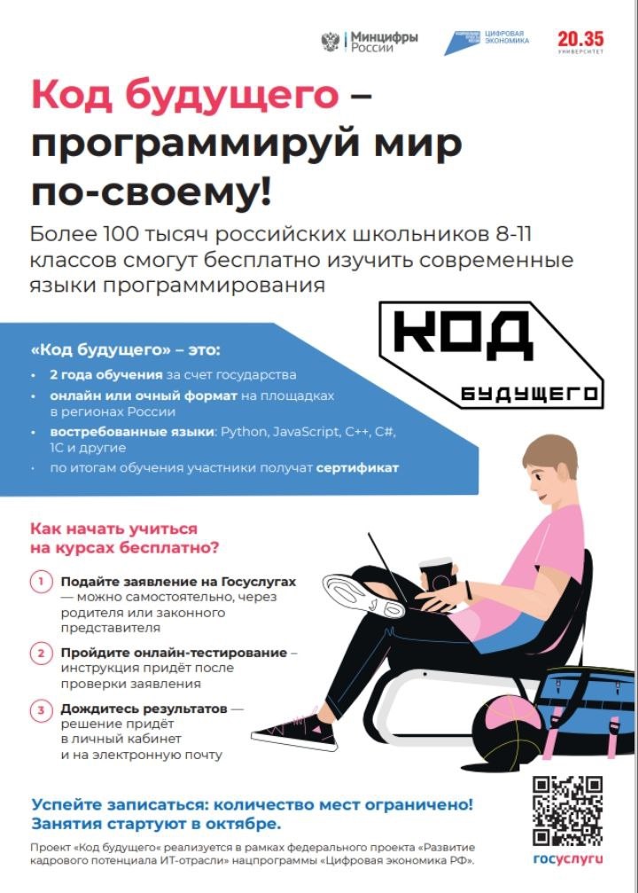 Проект «Код будущего» организован Минцифры России под эгидой федерального проекта «Развитие кадрового потенциала ИТ-отрасли» национальной программы «Цифровая экономика». Оператором образовательного проекта выступает Университет 2035.