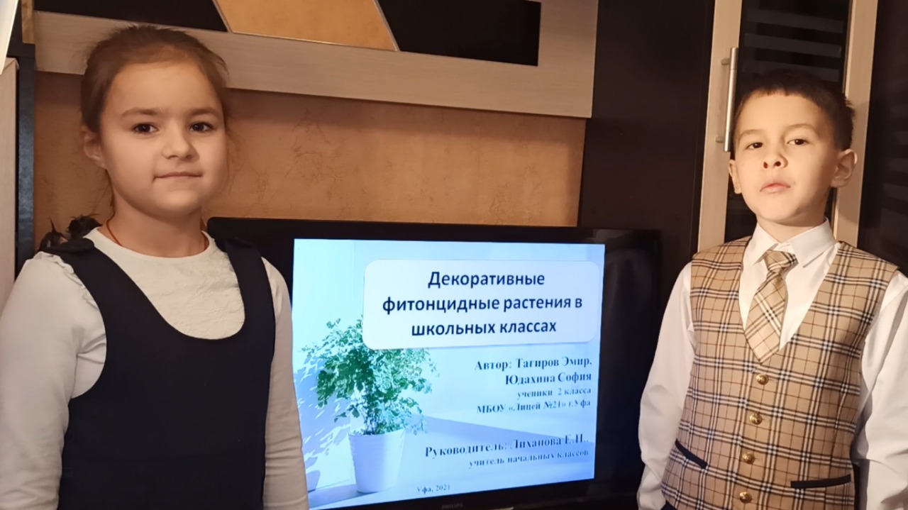 1 место в секции естественных наук: Юдахина София, Тагиров Эмир, 2Б класс. Тема: «Декоративные фитонцидные растения», учитель Лиханова Елена Николаевна.