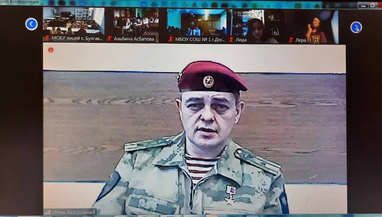 8 декабря 2021 года учащиеся 4А, 4В и 6А классов МБОУ «Лицей №21» городского округа город Уфа РБ приняли участие во Всероссийском онлайн – уроке мужества, посвященном Дню Героев Отечества, организованном Комитетом ветеранов РБ и Уфимским государственным нефтяным техническим университетом. В начале урока Долженко Светлана Аркадьевна рассказала о том, кто такие герои, почему и за что их славит и помнит Отечество, почему мы должны гордиться ими. С особым трепетом и волнением учащиеся и студенты РБ ждали встречи с настоящим героем - Героем России Игорем Сергеевичем Задорожным. Игорь Сергеевич рассказал ребятам о том почему он выбрал профессию военного, как проходила его воинская служба, с какими трудностями ему пришлось столкнуться. В прямом эфире учащиеся задавали множество вопросов Игорю Сергеевичу, на которые получили полные ответы. Урок прошёл на одном дыхании. В конце урока учащиеся и учителя поблагодарили организаторов и Игоря Сергеевича за интересную встречу и пожелали всем крепкого здоровья.