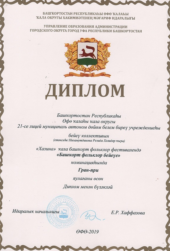 12декабря 2019 года в Уфе прошёл городской конкурс башкирских фольклорных коллективов "Хазина". В конкурсе приняли участие учащиеся лицея номер 21 Кировского района города Уфы под руководством Низамутдиновой Разиды Халидаровны и Азаматовой Лэйсэн Хафизовны. На конкурс в номинации "башкирский фольклорный танец" была представлен башкирский танец "Башкирские узоры" и песня "Такмак ". Учащиеся лицея номер 21 были удостоены высокой награды "Гран-при".