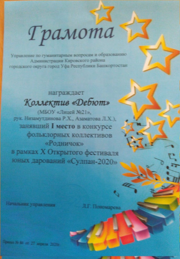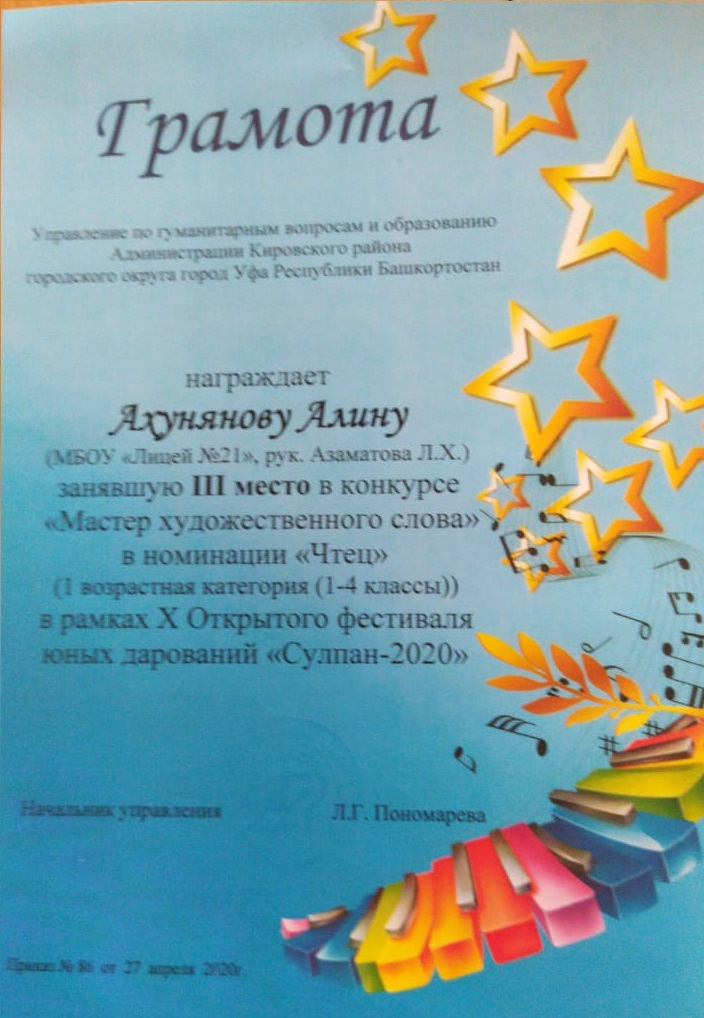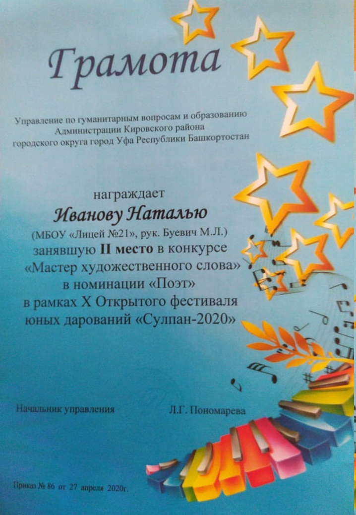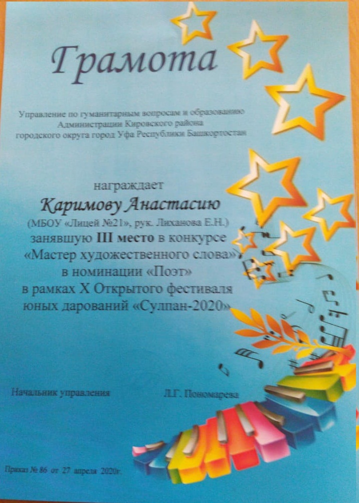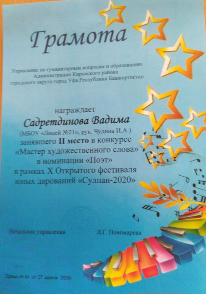 В рамках X Открытого фестиваля юных дарований "Сулпан - 2020" учащиеся нашего Лицея 21 приняли активное участие. В конкурсе "Мастер художественного слова" в номинации "Чтец", Климина Анна заняла 2место (рук. Вильданова С. Г.), Ахунянова Алина заняла 3 место (рук.Азаматова Л. Х.). В номинации "Поэт", Садретдинов Вадим занял 2 место (рук.Чудина И.А.), Иванова Наталья заняла 2место (рук.Буевич М. Л.), Каримова Анастасия заняла 3 место (рук.Лиханова Е. Н.)