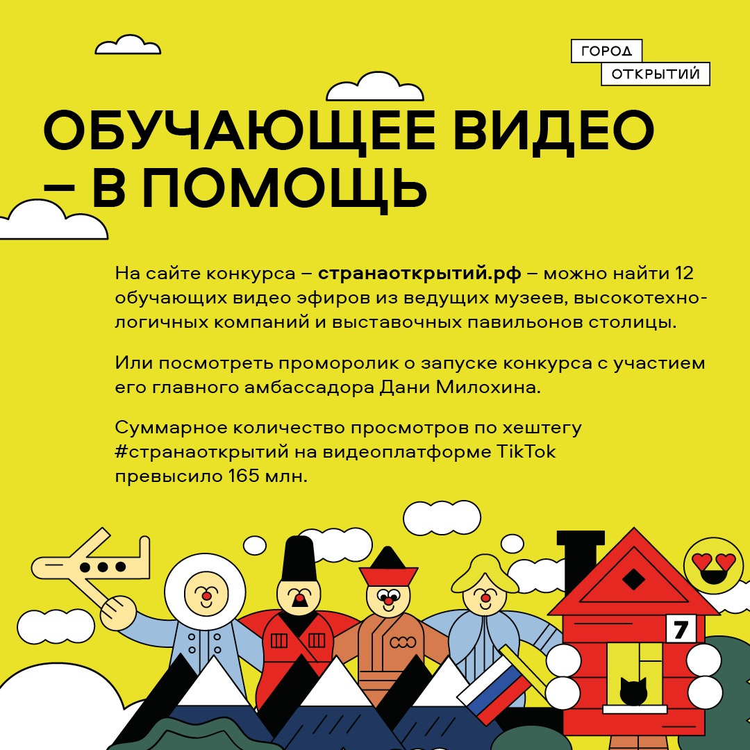 Прием заявок на конкурс для школьников 15-17 лет "Страна открытий" продлен до 31 мая. Сними видео в ТикТок про свой родной город, регион или край и получи приятные призы! Все подробности в карточках