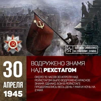 30 апреля 1945 года советские войска вели уличные бои в Берлине. Утром штурмовые батальоны перешли в атаку, пытаясь с трех направлений захватить Рейхстаг. Первая попытка не удалась. Потом была еще одна… Батальон старшего лейтенанта Самсонова, батальон капитана Неустроева и батальон майора Давыдова ворвались в здание, когда уже стемнело. На лестницах и в коридорах завязывались рукопашные схватки. Весь путь воинов красноармейцев от главного входа в Рейхстаг до крыши отмечался красными флагами и флажками.